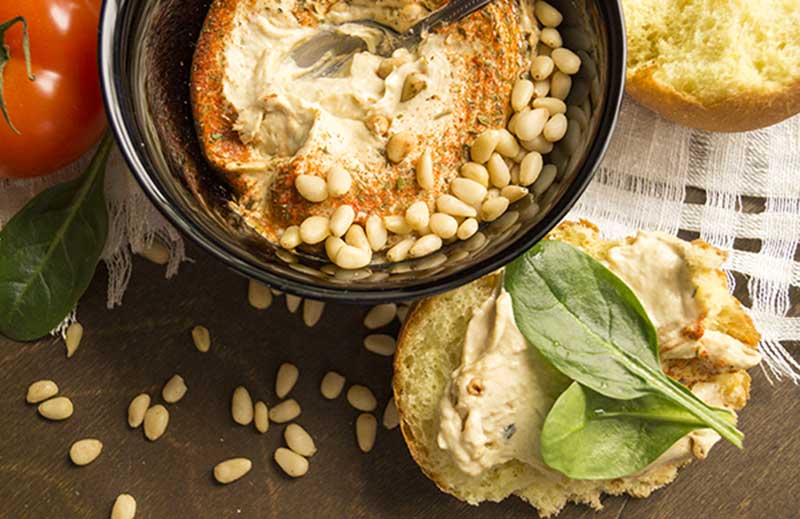 Hummus kan varmes i stekeovnen sammen med litt smør, pinjekjerner og en dryss paprika-krydder. Bruk cirka 1 spiseskje smør til 1,5 dl hummus. Varm alt sammen i en liten ovnfast form på 210 grader i 15 minutter. Spesielt godt på brød og til grønnsaker.