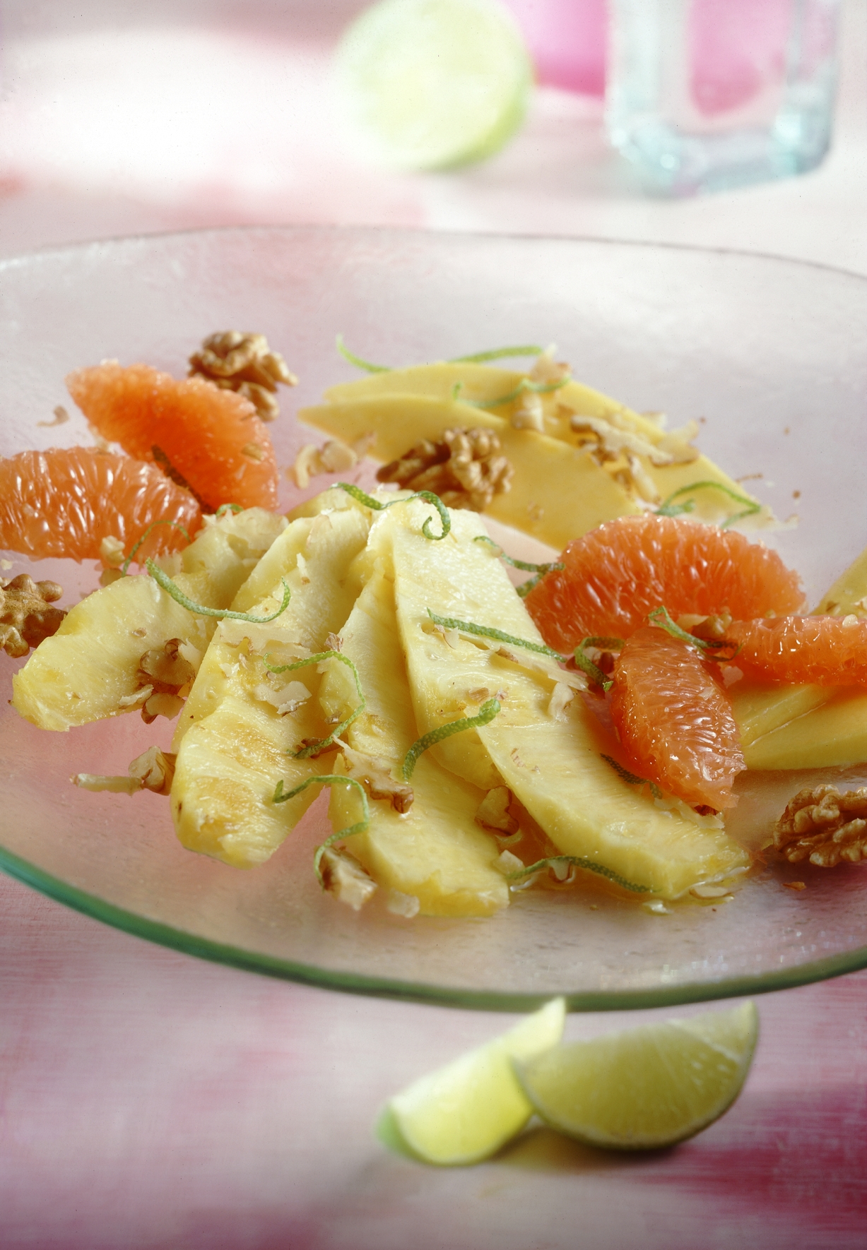 Skrell mangoen, skjær kjøttet fra steinen og del det opp i kiler. Skrell og fjern stilken fra ananasen og skjær den opp på langs i kiler. Fjern skallet og den hvite underhuden fra grapefrukten, skjær ut massen mellom skillemembranene, og ta vare på saften. Skyll og gni limen i varmt vann og skjær av tynne strimler av skallet med en skreller. Klem ut lime-juicen. Rør sammen limejuicen, lønnesirupen, valnøttoljen og den oppsamlede grapefruktjuicen til en blanding. Hakk opp halvparten av valnøttkjernene i biter. Fordel fruktbitene på tallerkenene, og dryss over hele og hakkede valnøtter og strimlene av limeskall. Drypp den flytende blandingen over sausen – og retten er klar til servering.