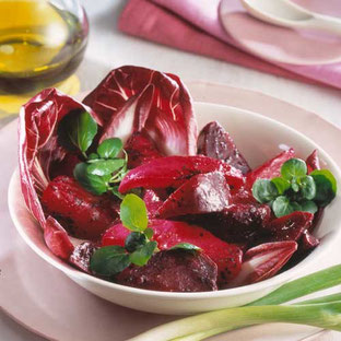 4. Skyll og del opp sikorien og karsen og bland med de resterende ingrediensene. Anrett og server sammen med potet- og rødbetsalaten.